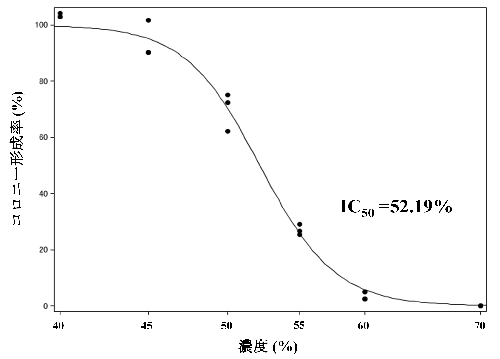 左の図は、弱い細胞毒性を有する陽性対照材料、0.25% Zinc dibutyldithiocarbamate (ZDBC) ポリウレタンフィルムの抽出液 (37℃で72時間振とう抽出) で処理した、プレートのギムザ染色写真です。抽出液の濃度が右側に向かって高くなるにつれて、細胞毒性の影響によりコロニー数の減少が確認できます。右図は、左図のコロニー数から算出したコロニー形成率 (%) のグラフです。図中のIC₅₀=52.19%は、コロニー形成率が50%に低下する抽出液の濃度を示しています。